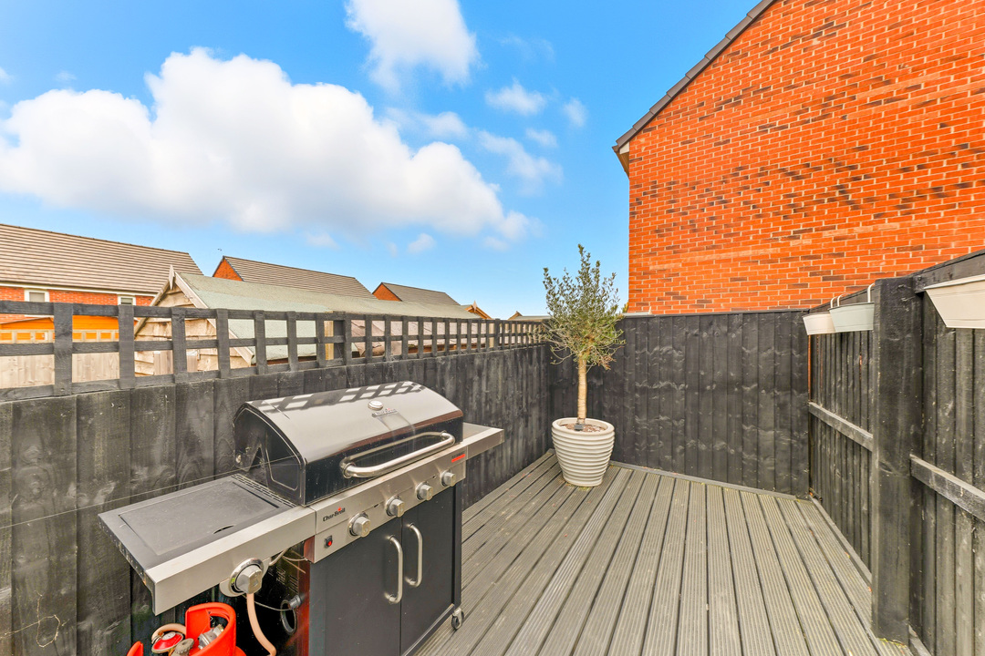 The home benefits from a large rear garden, part laid to patio and currently arranged with a seating and dining area for up to six people, fitted with a gas fire. A stone pathway leads across the lawn to a raised platform at the back, which features a barbecue area surrounded by plants. The garden is finished with a stone perimeter and built-in lighting, creating a beautiful atmosphere for relaxing or hosting in the evening.