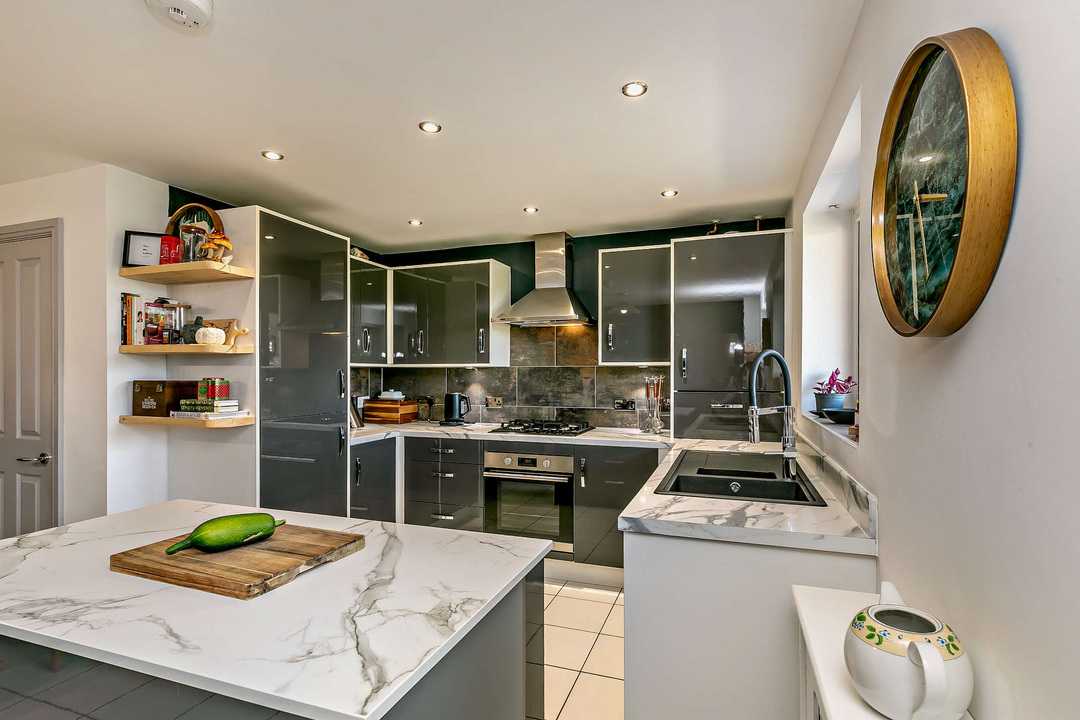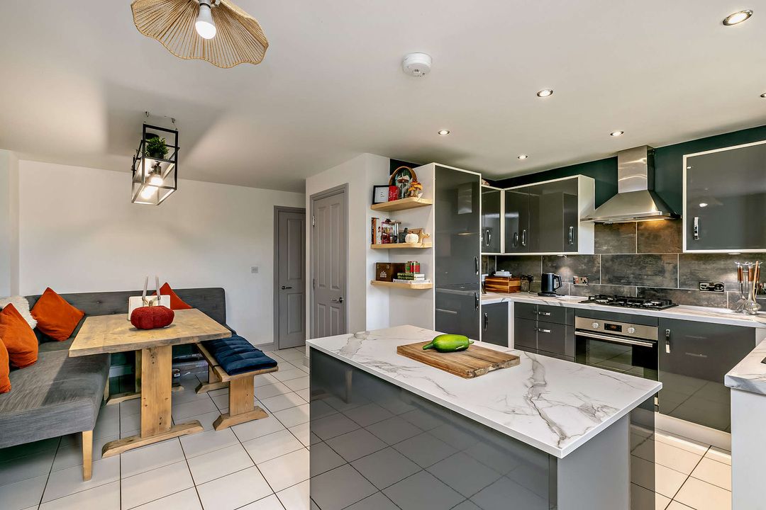 5.28 m x 4.82 mA large and modern kitchen installation, which benefits from premium tiled flooring and space for plenty of additional items of furniture. The current owner has opted for a eight seated dining table which is ideal for family dining. Central island added with "Dekton worktop" . Other features include: Double Glazed windows and French doors to the rear exterior, with beautiful views over the River Calder and rear patio access.Supported appliances include: an " New black four ring gas hob" - electric over and a fitted extractor fan above, and dishwasher . Premium worktops and a " New Designer black 1.5 sink and drainer with detachable spray tap. The room also benefits from a pantry, which adds to the existing storage capacity, and two Central Heated radiators.