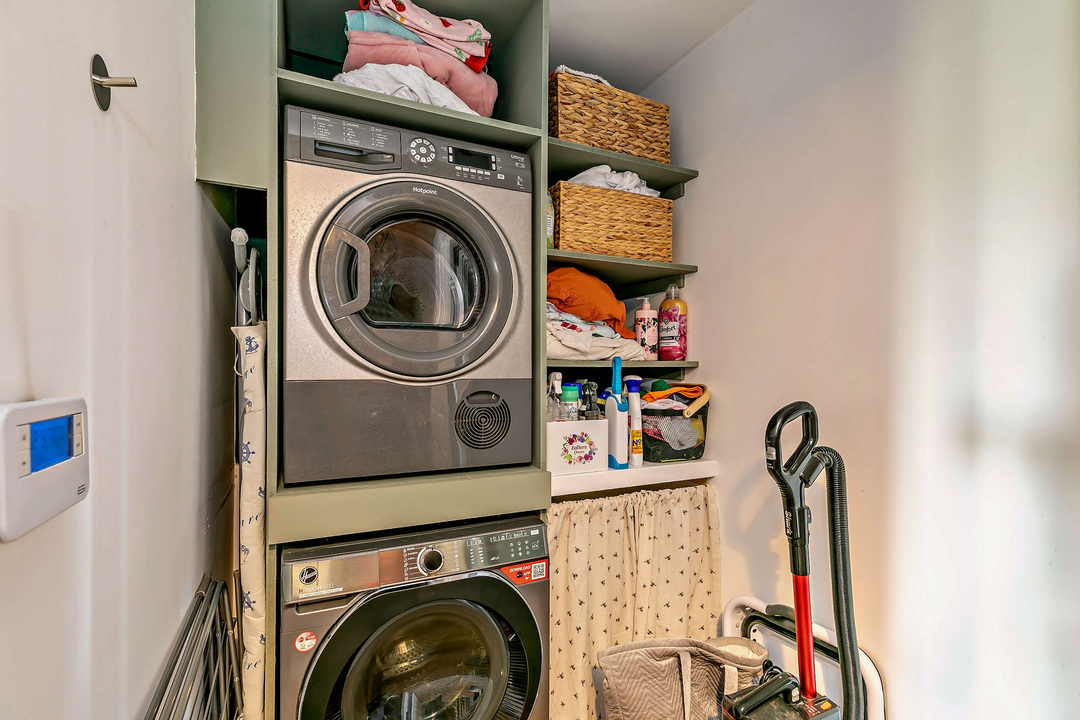 "Bespoke stackable unit fitted shelving" and featuring premium quality laminate flooring. Can accommodate a freestanding washing machine and a tumble dryer. Extractor fan with isolation switch.
