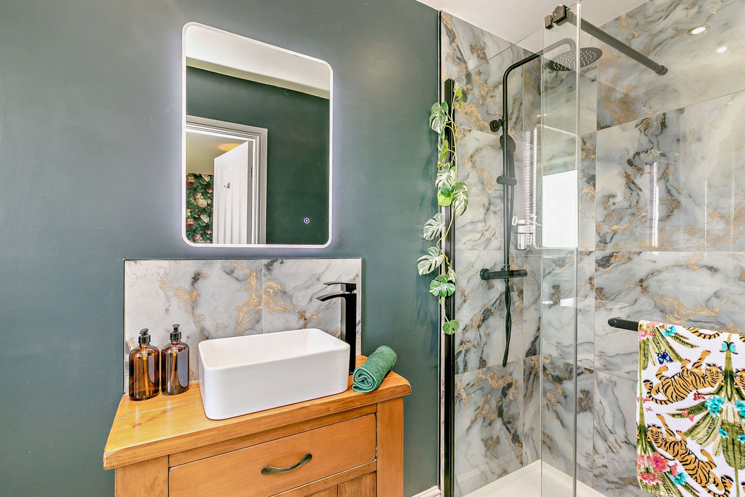 Very spacious, with premium floor and Features include: an "Designer oversized marble effect standing shower," a vanity unit with extra storage ,wash basin with a black mixer tap and matching " marble effect splash-backs" and a w/c. Central Heated towel rail a ‘frosted’ Double Glazed window to the rear elevation, an extractor fan with isolation switch and a power point for bathroom appliances. LED Mirror
