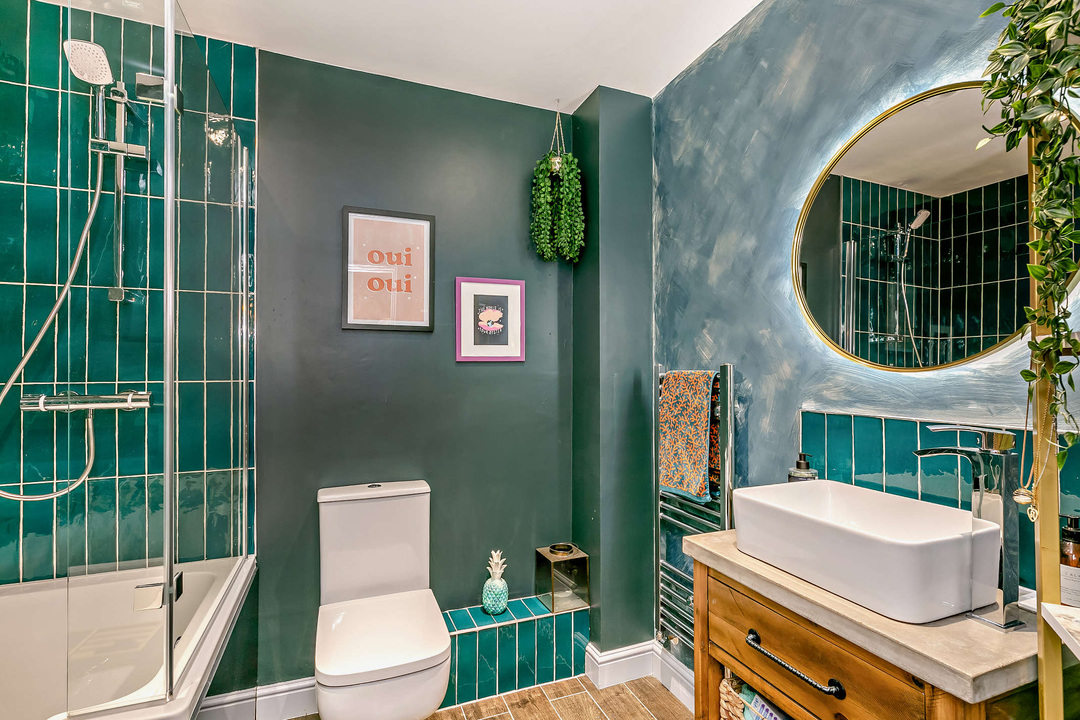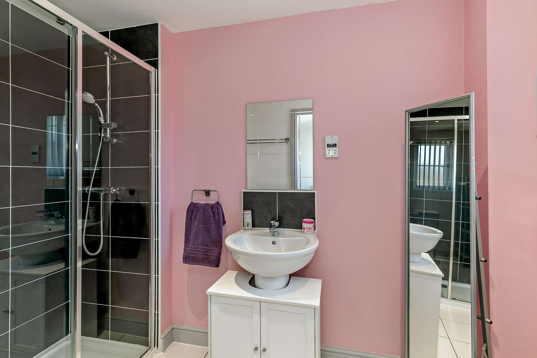Spacious, with premium floor and wall tiling. Features include: an oversized standing shower, a wash basin with splash-back tiles and a w/c. Central Heated radiator, a ‘frosted’ Double Glazed window to the front elevation and an extractor fan with isolation switch.
