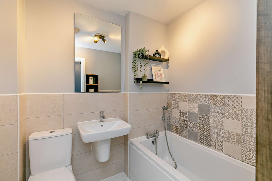 A contemporary design with premium tiling. Features include a W/C, a floating wash basin, a bathtub with a handheld shower fixture. Extractor fan with isolation switch, and a Central Heated towel rack.
