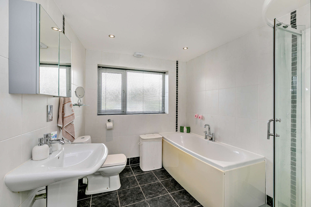 A very large ensuite comprising of a white four piece suite including low level flush WC, pedestal basin, bath and quadrant jacuzzi jet shower. Fully tiled walls and floor, room extraction, central heated chrome ladder style towel radiator, spotlights to the ceiling and ‘frosted’ PVCu double glazed window to the front aspect.