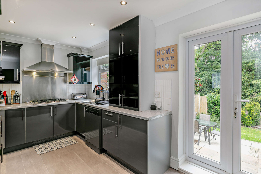 4.75 m x 2.54 mA modern black gloss design with a range of base and wall units providing ample storage and contrasting grey counter tops. Integrated appliances include: a 5 ring gas hob with stainless steel backsplash, stainless steel cooker hood extractor, double electric oven and stainless steel sink and drainer unit with mixer tap. Spotlights to the ceiling and recently upgraded Gas Combination Boiler. Large PVCu double glazed window to the rear aspect, PVCu double glazed French Doors to the rear aspect lead out to the rear garden and door leading off to a useful under stairs storage cupboard. The Kitchen also opens through into the extended element of the property, which has a useful open Utility Area and doors leading off to a Dining Room, WC and Office.